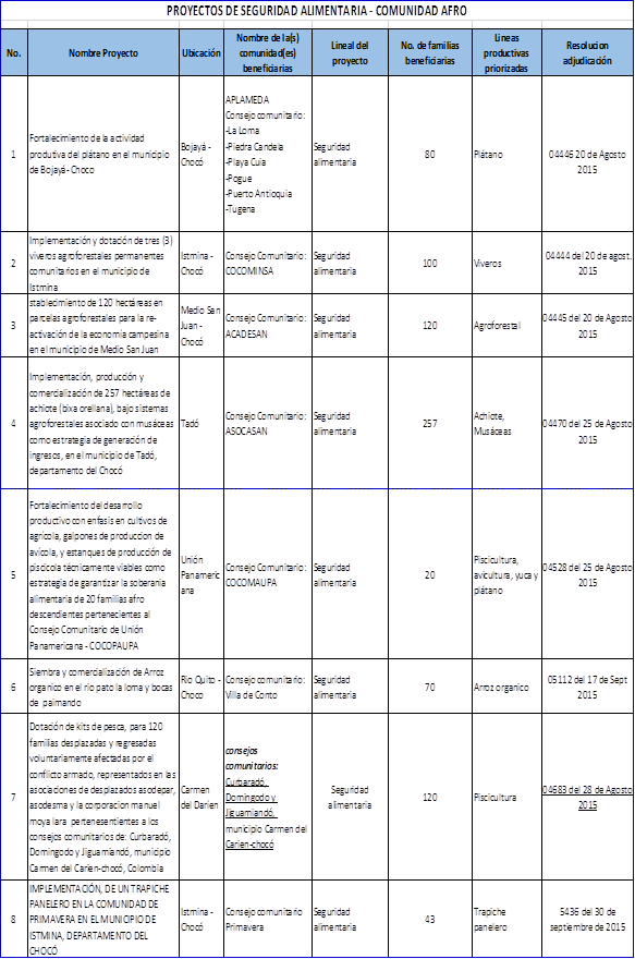 [344] Acandí, Bojayá, Lloró, Medio Atrato, Riosucio, Quibdó, Río Quito, Unguía, Carmen del Darién, Bagadó, Carmen de Atrato y Yuto (Chocó), y Murindó, Vigía del Fuerte y Turbo (Antioquia),