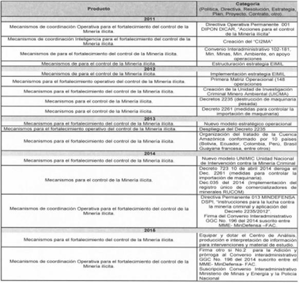 [331] Ibídem. Del mismo modo, se ha establecido que “se desarrollará una estrategia para desincentivar la explotación ilícita de minerales en toda su cadena. Para ello: 1) se buscará redoblar y ampliar los esfuerzos para controlar los insumos necesarios para esta actividad (principalmente el mercurio), implementando la legislación reciente sobre el particular para alcanzar este objetivo; 2) se trabajará en la cooperación internacional para luchar contra este fenómeno en zonas de frontera; 3) se exigirá a los ejecutores de obras de infraestructura la verificación de la procedencia lícita de los materiales de construcción utilizados en las mismas; 4) se desarrollará una herramienta con la que se le pueda hacer trazabilidad al mineral desde que se produce hasta que se comercializa; y, 5) se fortalecerá la capacidad de la autoridad minera para resolver las solicitudes de legalización de minería de hecho y las solicitudes de formalización de minería tradicional, para que en un término de 2 años se dé trámite a las solicitudes que actualmente están en curso”.