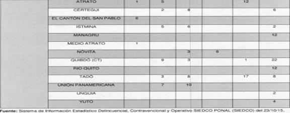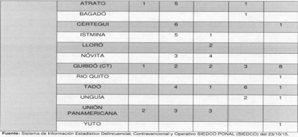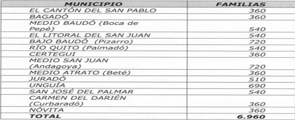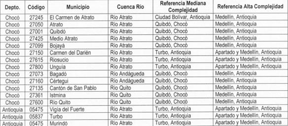 [338] Acandí, Bojayá, Lloró, Medio Atrato, Riosucio, Quibdó, Río Quito, Unguía, Carmen del Darién, Bagadó, Carmen de Atrato y Yuto (Chocó), y Murindó, Vigía del Fuerte y Turbo (Antioquia),