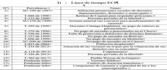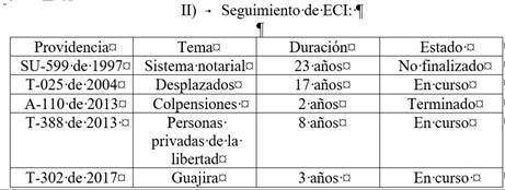 [864] La Corte Constitucional ha declarado el Estado de Cosas Inconstitucional a través de las siguientes providencias: SU-559 de 1997, T-068 de 1998, T-153 de 1998, SU-250 de 1998, T-289 de 1998, T-559 de 1998, T-590 de 1998, T-525 de 1999, T-606 de 1999, SU-090de 2000, T-025 de 2004, T-234 de 2012, A-110 de 2013, T-388 de 2013, T-762 de 2015 y T-302 de 2017.