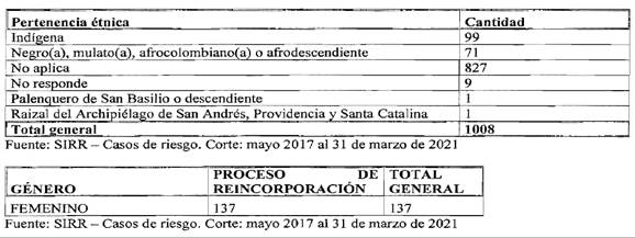 (…) la población firmante del Acuerdo Final de Paz en proceso de reincorporación a la vida civil enfrenta graves riesgos que no solo se proyectan negativamente sobre sus derechos fundamentales a la vida, a la integridad personal, a la seguridad y a la paz, sino repercuten de modo profundo en “los procesos políticos, sociales, económicos y culturales que permitirían el éxito del proceso de reincorporación y, con este, del Acuerdo Final de Paz”.