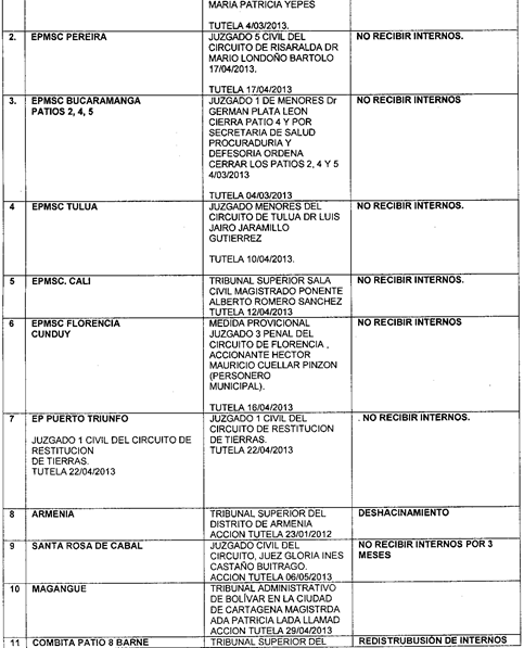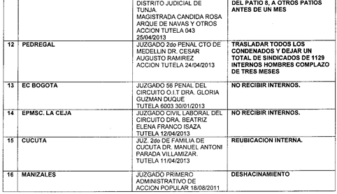 A continuación se hace referencia a los antecedentes de cada uno de los nueve (9) expedientes, en sus elementos principales y esenciales, agrupándolos por cárceles (seis en total: las cárceles de Cúcuta, la Tramacúa de Valledupar, la Modelo de Bogotá, Bellavista de Medellín, San Isidro de Popayán, y la de Barrancabermeja). La información detallada y datos relevantes de cada uno de estos expedientes, serán usados y expuestos a lo largo de las consideraciones; a medida que sean necesarios para analizar y resolver los problemas jurídicos planteados. En todo caso, se puede ver una descripción detallada y pormenorizada de cada uno de los expedientes en el segundo anexo que acompaña la presente sentencia.[2]
