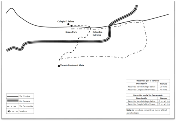 1.2. Afirmaron que como no cuentan con recursos económicos ni subsidios de la administración municipal para que las niñas y los niños puedan acceder al servicio de transporte, ellos deben desplazarse caminando desde la vereda El Salitre, sector Camino al Meta, ubicada en el costado occidental del río Teusacá, hacía la sede educativa. Relataron que habitualmente utilizaban un sendero peatonal, a manera de atajo, por el que se demoraban 20 minutos de ida y entre 30 a 40 minutos en el trayecto de regreso el cual atravesaba una parte del inmueble perteneciente a la sociedad Acción Fiduciaria S.A., punto en el que debían cruzar el río.