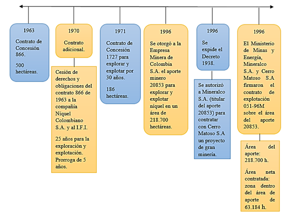 1. El 30 de marzo de 1963, el Ministerio de Minas y Petróleos de aquel entonces y la compañía Richmond Petroleum Company of Colombia suscribieron por treinta años el contrato de concesión núm. 866, sobre un área de 500 hectáreas, ubicadas en la región del Alto San Jorge, cuyo objeto era la exploración y explotación del níquel y de otros minerales asociados al mismo.