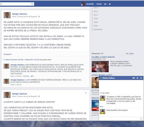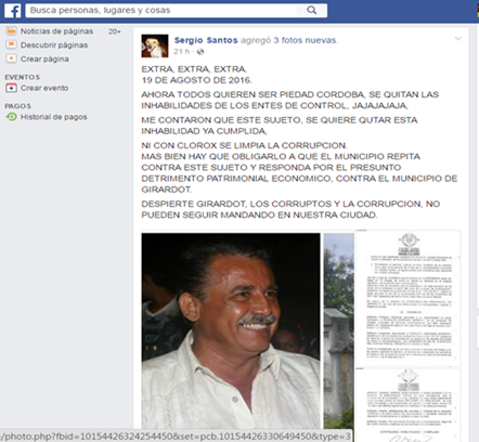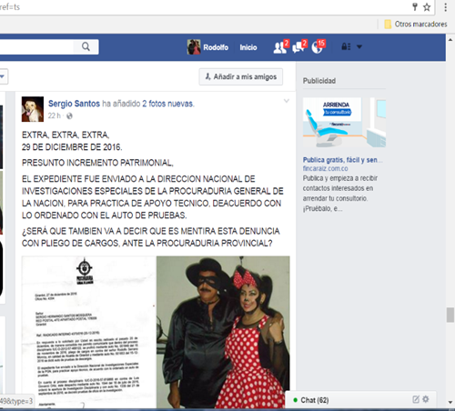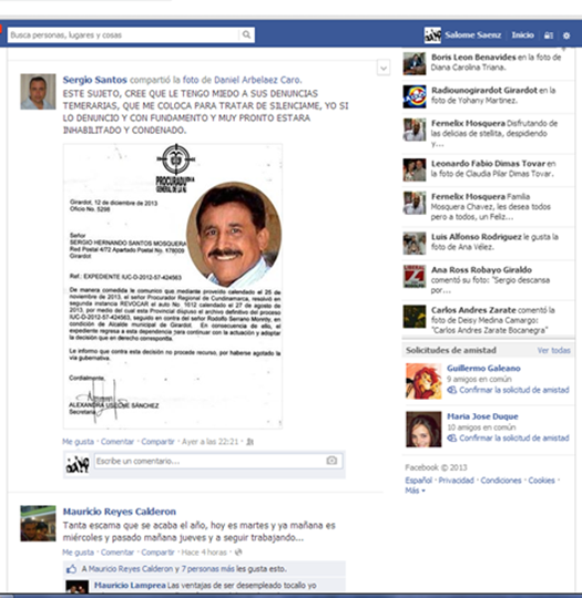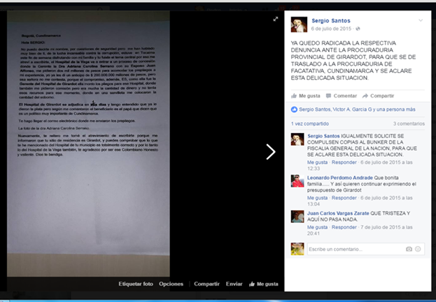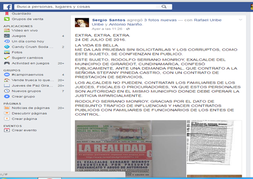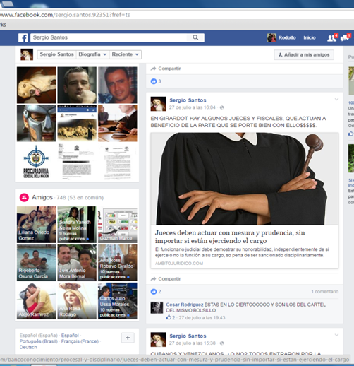 [101] Al expediente también se anexaron imágenes de publicaciones en la red social realizadas por Rodolfo Serrano en las que se cuestionan las críticas de Sergio Santos y se exponen los documentos correspondientes a actuaciones judiciales