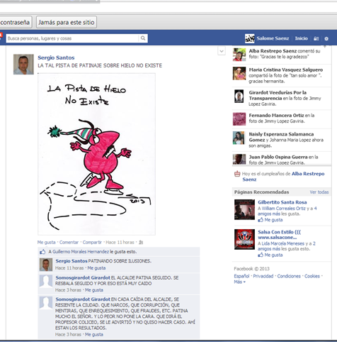 [98] En medio digital (disco compacto) se anexaron alrededor de 100 caricaturas publicadas en la página de Facebook del señor Santos y más de 600 imágenes de publicaciones realizadas en el perfil del accionado y en respuesta a publicaciones de terceros, desde el año 2009 hasta el 2013 aproximadamente. Adicionalmente, en físico, en el cuaderno 3 del expediente, los folios 186 a 529 corresponden a imágenes de publicaciones de Facebook.