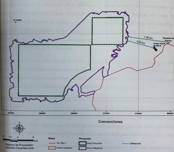 50. Frente a la vereda Santa Clara precisó que se encuentra dentro del área de influencia del Proyecto y que, en consecuencia, sus habitantes – incluida la propietaria del predio “El Encanto” – estuvieron involucrados en todo el proceso de socialización. Indicó que “El Encanto” está demarcado como zona de exclusión y que no hace parte de los territorios colectivos del Consejo Comunitario Panamá de Arauca, sino que es una propiedad de un individuo que pertenece a dicho Consejo[121]. Aclaró que entre el área de influencia del Proyecto y el predio “Aguas Blancas” hay 4.93 kilómetros. También que el área de influencia y el Centro Poblado Panamá de Arauca están separados por 7.36 kilómetros[122]. De esta manera, los asentamientos que se encuentran fuera del área de influencia del proyecto, como se evidencia en la imagen posterior, no reciben ninguna afectación directa del Proyecto[123]: