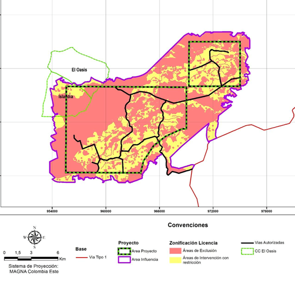 20.1. Con relación a la vereda el Oasis (Expediente T-7.466.000): El acto administrativo precisa que el área superpuesta entre la vereda y el área total del proyecto se clasificó como una zona de exclusión donde no se pueden desarrollar actividades. Esta área superpuesta equivale al 0.96% del área total del proyecto[27]. Las tierras sobre las que el Consejo Comunitario el Oasis alega titularidad colectiva están por fuera del área de influencia del proyecto[28]. La exclusión obedece a que el área “no cuenta con vías de acceso, de acuerdo con lo establecido en el EIA y lo autorizado en la licencia ambiental”[29].