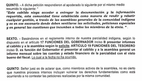 4. La anterior petición fue contestada el 24 de agosto de 2020, a través de un escrito firmado por varios de los miembros del cabildo elegido para el año 2019[12]. En su respuesta, ellos negaron el acceso a la documentación y a la información requerida, bajo la premisa de que “esta comunidad tiene establecida como manera de rendir y rebatir cualquier gestión, [el hacerlo] a través de las asambleas generales (…) y es en ese escenario donde deben ventilarse las solicitudes, peticiones especiales y en general las cuestiones que incumban a todos los miembros de la etnia”[13]. Además, destacaron que los comuneros deben someterse a la ley indígena y a las costumbres del colectivo, por lo que advirtieron que, una vez se supere la contingencia generada por el COVID-19, se hará la convocatoria correspondiente a la asamblea, en la que los interesados podrán debatir los asuntos que sean de su interés.