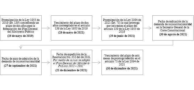38. En el asunto bajo examen, la disposición acusada estaba sujeta a un término de vigencia específico, toda vez que el Plan Decenal del Ministerio Público debía “formularse dentro de los dos (2) años siguientes a la promulgación” de la Ley 1955 de 25 de mayo de 2019[36]. En consecuencia, el plazo para expedir el referido instrumento de planeación, que debía ser elaborado con la participación de la Vicepresidencia de la República, venció el 25 de mayo de 2021[37]. No obstante, el legislador incluyó en la Ley 2094 de 2021, promulgada el 29 de junio de 2021[38], el siguiente artículo: