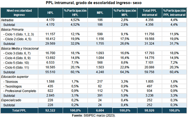 [290] Informe estadístico No. 3. Población privada de la libertad – INPEC. Oficina Asesora de Planeación – Grupo estadística. Marzo del 2023. p. 26