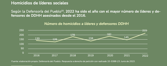 https://www.defensoria.gov.co/es/nube/comunicados/10368/Defensor%C3%ADa-del-Pueblo-presenta-reporte-de-conductasvulneratorias-contra-l%C3%ADderes-sociales-durante-el-primer-semestre-de-2021-l%C3%ADderes-socialesDefensor%C3%ADa-informe.htm Somos Defensores. “Contra las cuerdas: Informe Anual 2016 Sistema de Información Sobre Agresiones Contra Defensores de DDHH en Colombia SIADDHH”. 2017. Pág. 9. Disponible en: https://somosdefensores.org/wpcontent/uploads/2018/08/Documentos/TODOS%20LOS%20INFORMES/informes%20en%20espa%C3%B1ol/informes%20anuales/INFORME%20SOMOS%20DEFENSORES%202016%20ANUAL_ESPA%C3%91OL.pdf ; Somos Defensores. “Piedra en el zapato: Informe Anual 2017 Sistema de Información Sobre Agresiones Contra Defensores de DDHH en Colombia SIADDHH”. 2018. Pág. 9. Disponible en: https://somosdefensores.org/wp-content/uploads/2019/05/INFORME-SOMOS-DEFENSORES-2017-ANUAL_ESPAN%CC%83OL.pdf ; Somos Defensores. “La naranja mecánica: Informe Anual 2018 Sistema de Información Sobre Agresiones Contra Defensores de DDHH en Colombia SIADDHH”. 2019. Pág. 40. Disponible en: https://somosdefensores.org/wpcontent/uploads/2019/04/informe-somos-defensores-2019-espanol-web.pdf ; Somos Defensores. “La ceguera: Informe Anual 2019 Sistema de Información Sobre Agresiones Contra Defensores de DDHH en Colombia SIADDHH”. 2020. Pág. 47. Disponible en: https://drive.google.com/file/d/1jYXd8GjrDjOERyTOJG5gDA4A55UEqYVN/view ; Somos Defensores. “La mala hora: Informe Anual 2020 Sistema de Información Sobre Agresiones Contra Defensores de DDHH en Colombia SIADDHH”. 2021, Pág. 9. Disponible en: https://drive.google.com/file/d/1Ze-GofhR6k0c23oUCVN-ZlWrEMPH03JV/view INDEPAZ. “Informe especial de Derechos Humanos Situación de lideresas y líderes sociales, de defensoras y defensores de derechos humanos y de excombatientes de las Farc-EP y sus familiares”. Junio de 2018. Gráfica 7. Disponible en: http://www.indepaz.org.co/wp-content/uploads/2020/07/1.-INFORME-ESPECIAL-Todos-los-nombres-todos-los-rostros.-5-dejunio-2018-Indepaz-Marcha-Cumbre.pdf ; INDEPAZ. “INFORME ESPECIAL: Registro de líderes y personas defensoras de DDHH asesinadas del 24/11/2016 al 15/07/2020”. 15 de julio de 2020. Pág. 5. Disponible en: http://www.indepaz.org.co/wpcontent/uploads/2020/07/3.-Informe-Especial-Asesinato-lideres-socialesNov2016-Jul2020-Indepaz-2.pdf ; INDEPAZ. “LÍDERES SOCIALES Y DEFENSORES DE DERECHOS HUMANOS ASESINADOS EN 2020”. S.F. Disponible en: http://www.indepaz.org.co/lideres/7 Fundación Ideas para la Paz. “10 dinámicas que marcarán la violencia organizada en 2021”. 2 de febrero de 2021. Punto 6. Disponible en: https://www.ideaspaz.org/publications/posts/1945