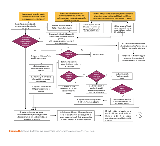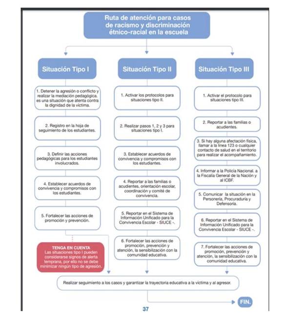 La Secretaría de Educación del distrito de Bogotá elaboró un Protocolo … que no solo está diseñado para atacar el racismo estructural sino también el racismo cotidiano. En ese sentido, identifica unas señales de alerta y unos síntomas de alerta de situaciones que pueden constituir un acto de racismo o ayudar a identificar a las personas que pudieron ser víctimas. Esto, con la intención de que los actos puedan ser reconocidos por cualquier miembro de la comunidad educativa.