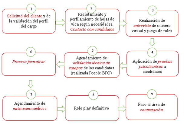 [206] En respuesta al segundo decreto de pruebas, la empresa Alianza Empresarial Temporal S.A.S indicó que el proceso de selección que adelantó en el caso concreto, fue el siguiente: “primero, se desarrolla un filtro inicial de recurso humano, consistiendo en el proceso de reclutamiento con el perfil propuesto por la empresa usuaria, posterior al reclutamiento de las hojas de vida seleccionadas, se procede a una entrevista inicial, posterior a este proceso se realizan los exámenes médicos de ingreso de conformidad a los postulados normativos, luego pasan una entrevista de adaptación técnica con la empresa usuaria para identificar aptitudes y habilidades frente al puesto a suministrar y el ultimo filtro es el visto bueno del cliente con el proceso mencionado culminado”. Archivo digital. Expediente T- 9.661.412. Documento “Respuesta People BPO Corte Constitucional”. P. 1