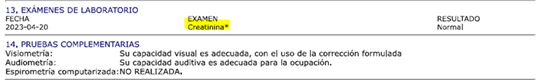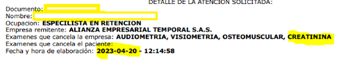 §36. Medicina y Salud Ocupacional Total (Medisot) SAS. El 14 de diciembre de 2023[53], allegó copia de los protocolos usados para tomar, conservar y realizar el embalaje de las muestras, así como aquel relacionado con la fase de analítica química. También destacó que la finalidad de la prueba de creatinina es verificar el funcionamiento de los riñones y manifestó que no es posible establecer el estado de embarazo a partir de la muestra procesada. Por otra parte, sobre la comunicación de los resultados de los exámenes practicados a las personas que participan en los procesos de selección, indicó que “si el paciente requiere copia del historial clínico debe realizar la solicitud de la misma en el área de recepción bajo las definiciones del artículo 1 y 14 de la resolución 1995 de 1999”[54]. Por último, remitió la historia clínica ocupacional de la accionante y de Sebastián que también participó en el proceso de selección.