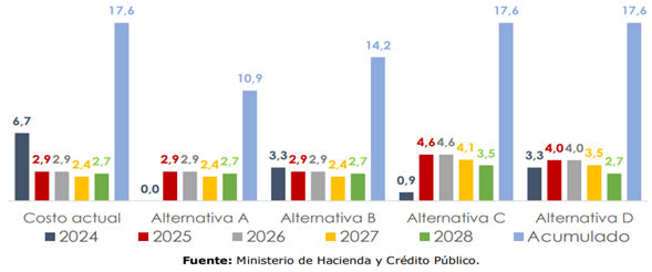 41. El siguiente cuadro resume el impacto fiscal estimado de cada alternativa en billones de pesos: