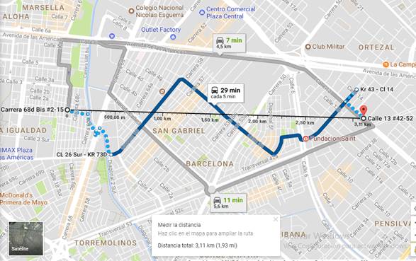 h. Distancia Casa-Colegio: En este aspecto, exige la norma que los estudiantes que pretenden beneficiarse del subsidio de transporte deban llevar a cabo un recorrido peatonal de más de 2 km entre la casa y el colegio, situación que también se acredita, teniendo en cuenta que el Colegio La Merced se encuentra ubicado en la Calle 13 # 42-52 [31], mientras que las menores residen en la Carrera 68 D Bis # 2-15[32]. Así, verificada la distancia en mapa, el trayecto es de más de 4 km de distancia (la ruta más corta en vehículo) y, trazando una línea recta entre el lugar de vivienda y el colegio, se determina que la distancia entre ambos puntos es de más de 3 km, tal como se observa en la siguiente imagen: