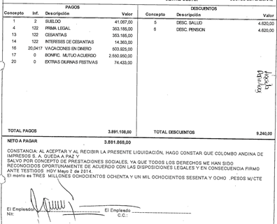 7. De manera posterior, la empresa Colombo Andina de Impresos S.A. liquidó el contrato de María Delia Lozano y pagó la suma de $3.881.868 por los conceptos que se evidencian a continuación[4]: