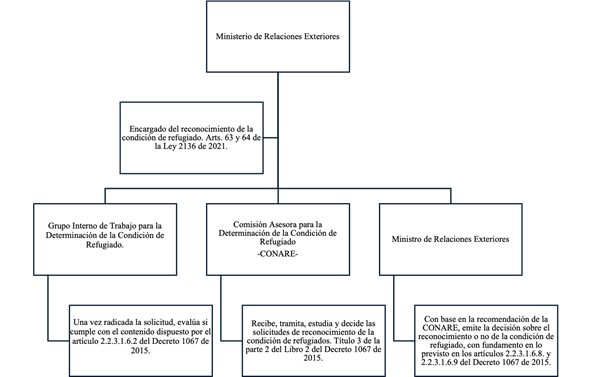 [160] Parágrafo del artículo 62 de la Ley 2136 de 2021. Adicionalmente, el artículo 63 de la misma ley dispone que “el reconocimiento de la condición de refugiado estará a cargo del Ministerio de Relaciones Exteriores de acuerdo con el procedimiento establecido por el Decreto 1067 de 2015 o las normas que lo modifiquen, adicionen o sustituyan”.
