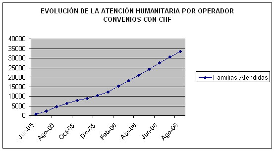 [27] A través de los operadores por los convenios con CHF se atiende en Cartagena, Santa Marta, Cali, Bucaramanga, Barranquilla, Bogotá, Soacha y otros municipios cercanos, Valledupar, Ibagué, Neiva, Armenia, Cartago, Pereira, Manizales, Medellín, Sincelejo, Cúcuta, Villavicencio, Florencia, Pasto, Riohacha, Mocoa, Puerto Asís, Buenaventura, Arauca, Barrancabermeja, San José del Guaviare, Apartadó, Montería y Popayán.