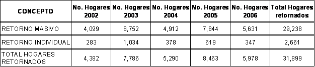 En relación con el proceso de retorno, la Procuraduría encuentra graves falencias, pues según reporta Acción Social “los hogares retornaron sin que se formulara un ‘Plan de Retornos’” por parte del Comité. No expone las razones de esta falla ni brinda información sobre las condiciones de seguridad en la zona a la cual retornaron los desplazados.
