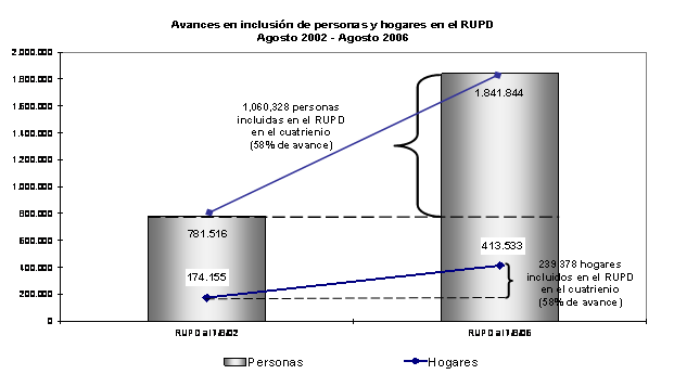 Acción Social reporta un avance en la identificación e inclusión de personas desplazadas del 58%, haciendo una comparación entre lo registrado en el año 2002 y en el año 2006, así: