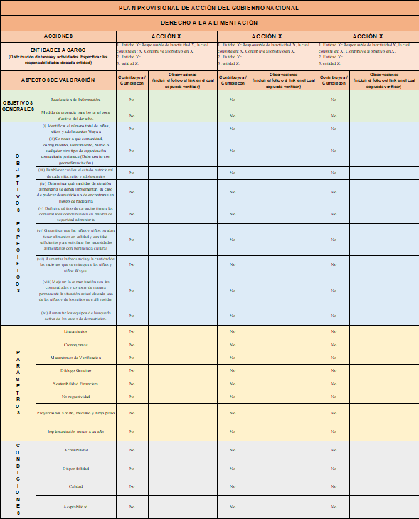 El considerando 142, al especificar las medidas cautelares por adoptar, establece que: "esta corporación precisa que los objetivos de este Plan Provisional de Acción giran principalmente en torno a dos componentes: los objetivos relacionados con la recolección de información y aquellos que corresponden propiamente a medidas urgentes orientadas a lograr el goce efectivo de los derechos de la niñez Wayuu". |