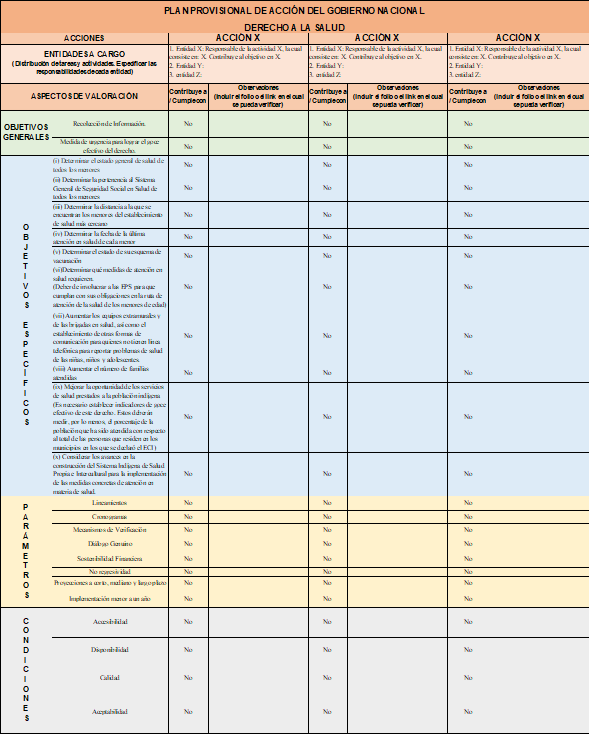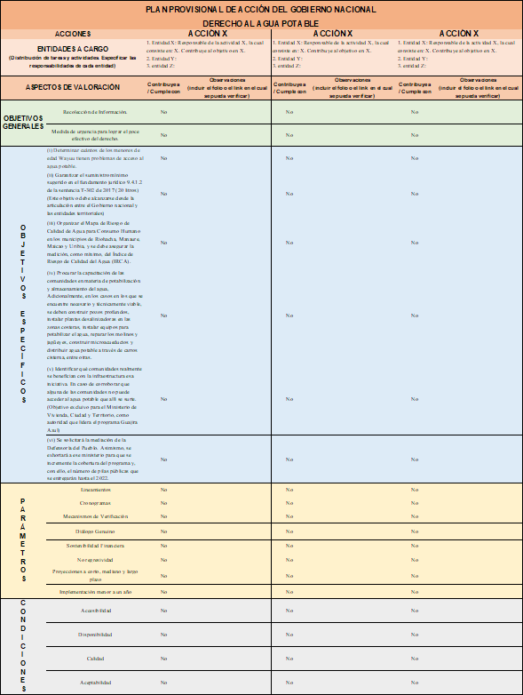 [45] Las entidades responsables se encuentran detalladas en el Resuelve Primero del Auto 696 de 2022, el cual dice: “ORDENAR a la Presidencia de la República, al Ministerio de Salud y Protección Social, al Ministerio de Vivienda, Ciudad y Territorio, al Ministerio de Ambiente y Desarrollo Sostenible, al Ministerio de Agricultura y Desarrollo Rural, al Ministerio de Hacienda y Crédito Público, al Departamento Administrativo para la Prosperidad Social, al Departamento Administrativo Nacional de Estadística DANE, al Instituto Colombiano de Bienestar Familiar, a la Superintendencia Nacional de Salud, a la Unidad Nacional para la Gestión del Riesgo de Desastres, al Departamento de La Guajira y a los municipios de Uribia, Manaure, Riohacha y Maicao, como entidades responsables del cumplimiento de los objetivos mínimos constitucionales que estableció la sentencia T-302 de 2017 (acceso, disponibilidad, calidad y aceptabilidad, respectivamente), que en el marco de sus competencias, determinen los lineamientos, el cronograma y los mecanismos de verificación para la construcción de un Plan Provisional de Acción que permita el goce efectivo los derechos fundamentales de los menores de edad protegidos por la sentencia T-302 de 2017 y garantice la existencia de un diálogo genuino con las autoridades legítimas del pueblo Wayuu. De igual modo, esas entidades tendrán la responsabilidad de determinar cuáles serán las fuentes de financiamiento de las medidas concretas que se implementarán con ocasión de este Plan Provisional de Acción. Las medidas concretas por implementar no podrán proyectarse inicialmente por un tiempo mayor a un año ni tampoco podrán ir en detrimento de las acciones que actualmente se están implementando.