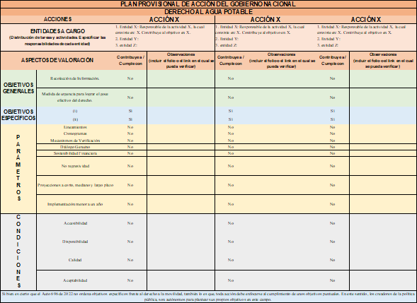 11. Teniendo en cuenta los antecedentes mencionados, este auto tiene la siguiente estructura. En primer lugar, se reiteran los parámetros del Auto 696 de 2022 con base en los cuales se analizará el Plan Provisional de Acción -en adelante Plan- remitido (sección A). En segundo lugar, se presentan las observaciones respecto de las acciones propuestas en el Plan, analizando si cumplieron con lo ordenado en el mencionado auto (sección B). En tercer lugar, se exponen las conclusiones derivadas del análisis y se enuncian las decisiones que se adoptarán (sección C). En cuarto lugar, se describen las órdenes a proferir (sección D).