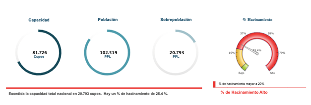 29. Se tiene registro que, con corte a noviembre de 2023, la población privada de la libertad en establecimientos de reclusión del orden nacional es de 102.519 personas a pesar de tener una capacidad en los ERON para 81.726 personas. Esto se traduce en una sobrepoblación de 20.793 personas y un hacinamiento global del 25,4%.