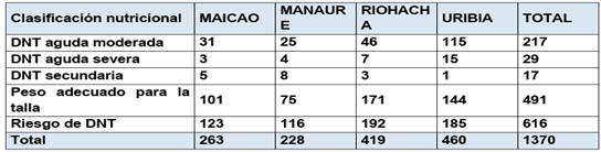 [15] De acuerdo con el portal SINERGIA, en desarrollo de los Comité de Emergencia Nutricional, se registró por parte de las EAPB el seguimiento efectivo de 1370 niños y niñas con DNT (82,9 %). El porcentaje de seguimiento efectivo por municipio fue en Uribia del 78,2% (460), Maicao el 84,2% (263), Manaure el 85,7% (228) y el Distrito de Riohacha el 86,2% (419). La fórmula del indicador es la siguiente: (Número de niños niñas de 0 a 59 meses de edad, atendidos y en seguimiento en el marco del comité de emergencia / Número de niños niñas de 0 a 59 meses de edad identificados en el marco del comité de emergencia) *100.