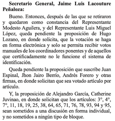 [107] Ibidem. Algunas de esas proposiciones fueron presentadas por Alfredo Mondragón, Juan Espinal, Juan Daniel Peñuela, Jhon Jairo Berrio Hernán Cadavid, Yulieth Sánchez, Betsy Pérez, Miguel Polo Polo y José Jaime Uscátegui, entre otros.